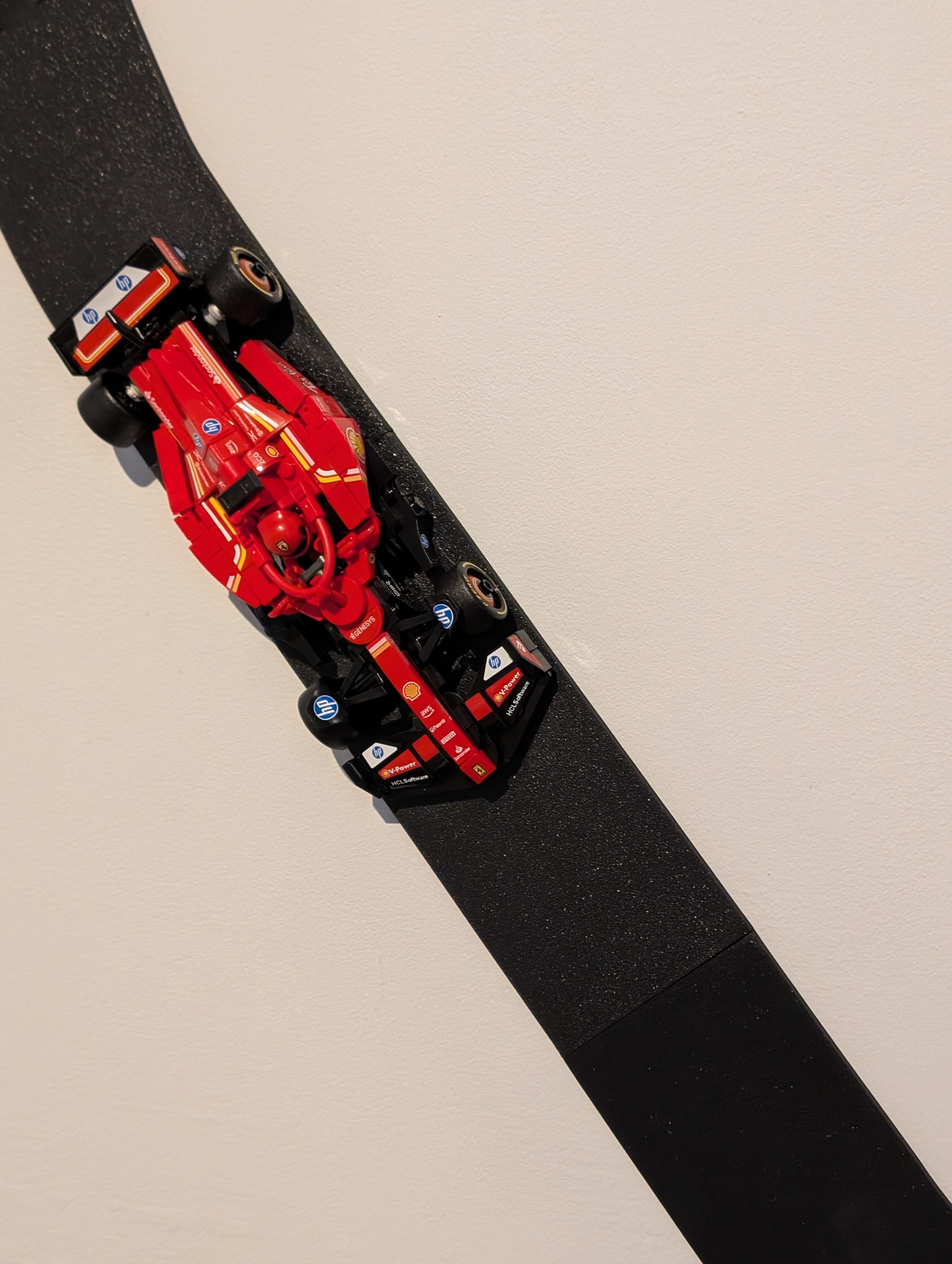 🚗 Jak to działa: Elementy toru montuje się na ścianie za pomocą taśmy dwustronnej. Auta LEGO można również przymocować w ten sam sposób, tworząc realistyczną scenę wyścigową.