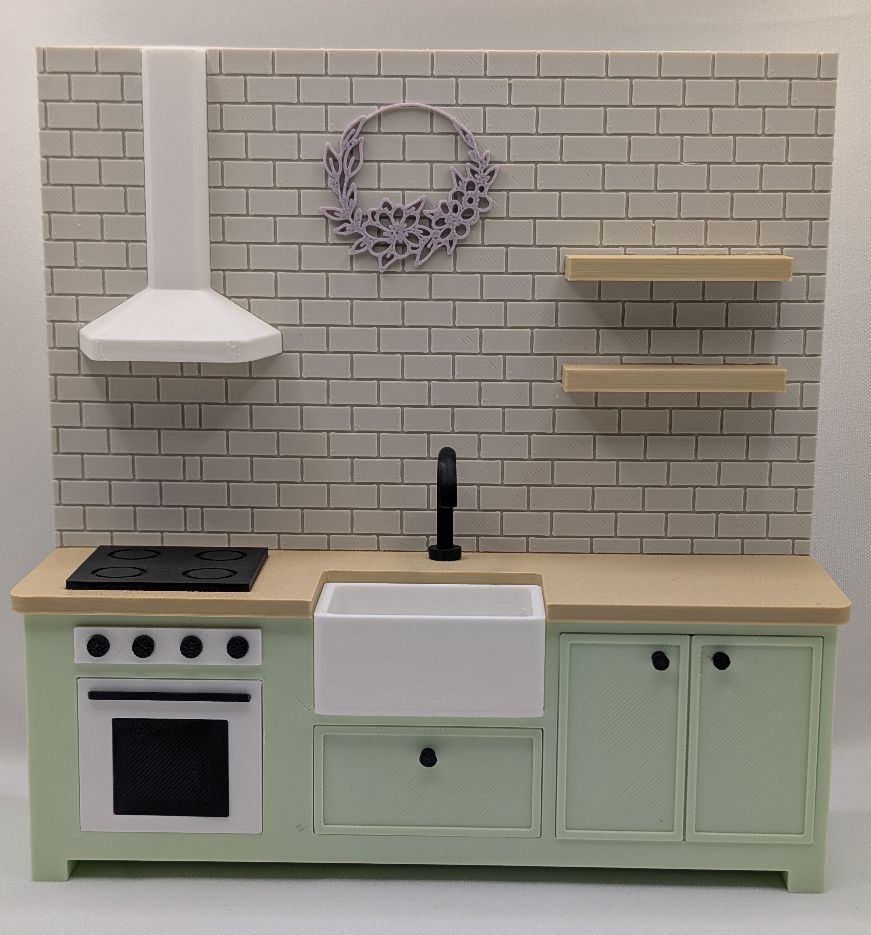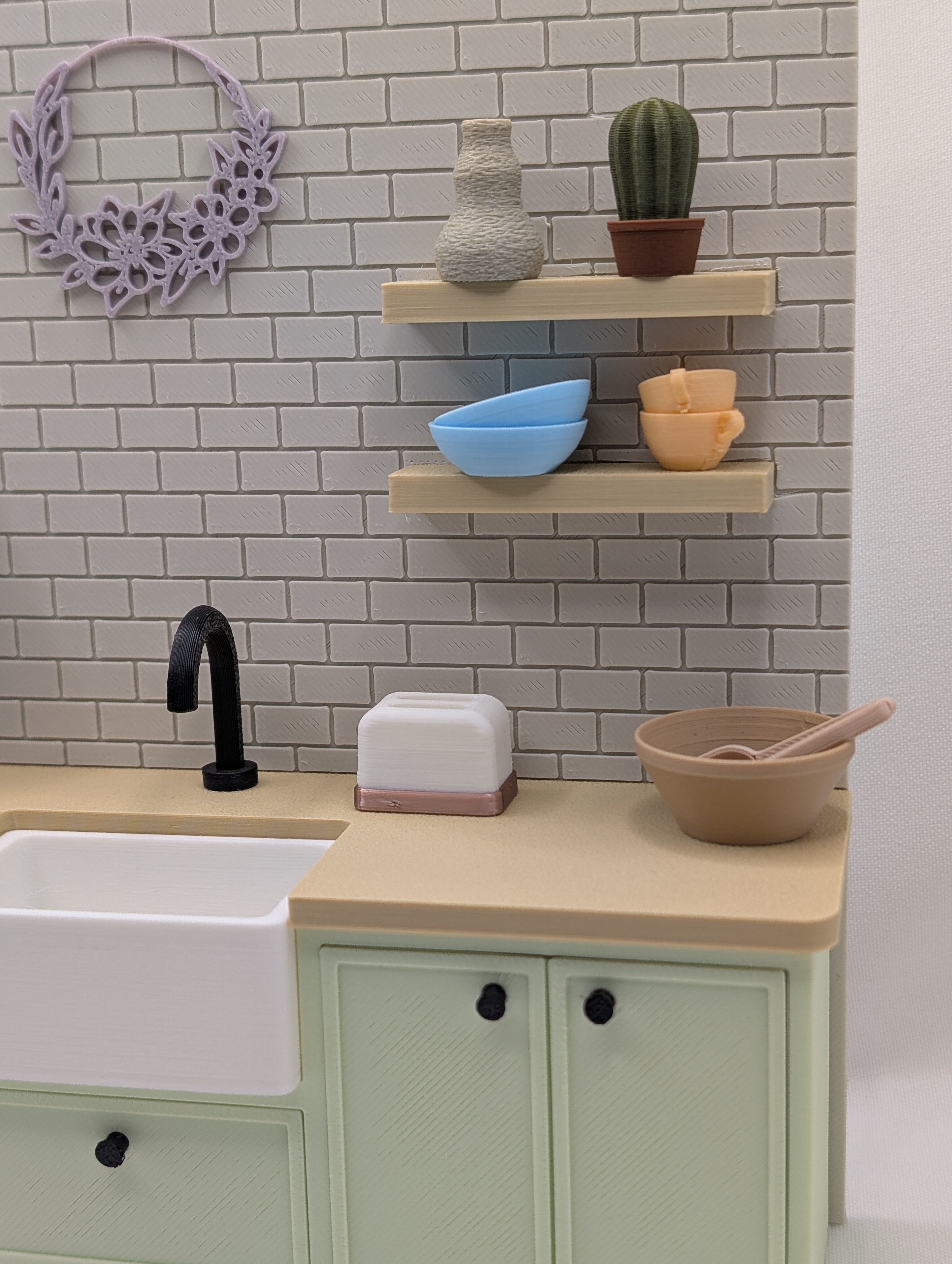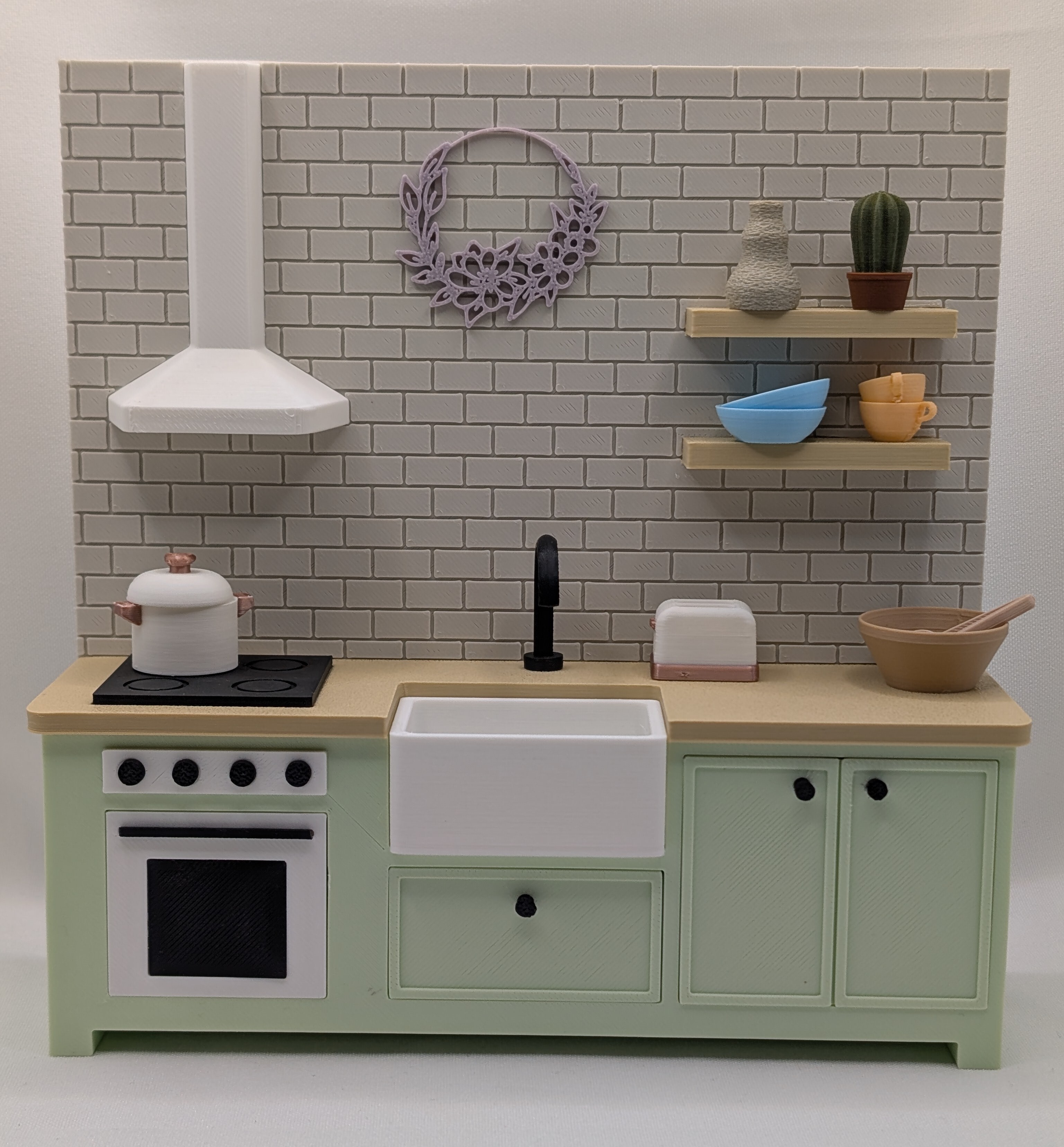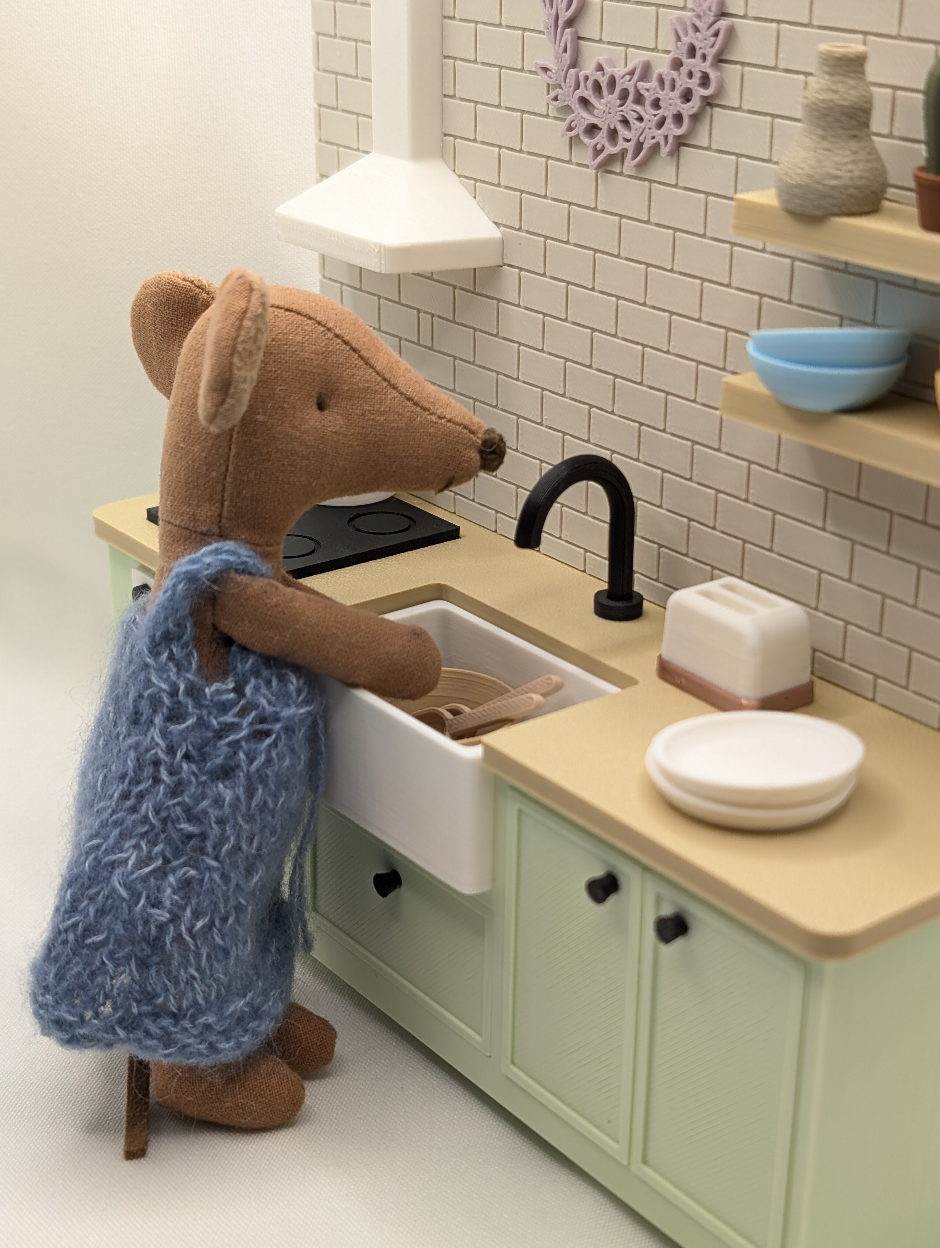 Każdy element został precyzyjnie wydrukowany w technologii 3D, z dbałością o najmniejsze szczegóły – od faktury płytek po maleńkie uchwyty przy szafkach.