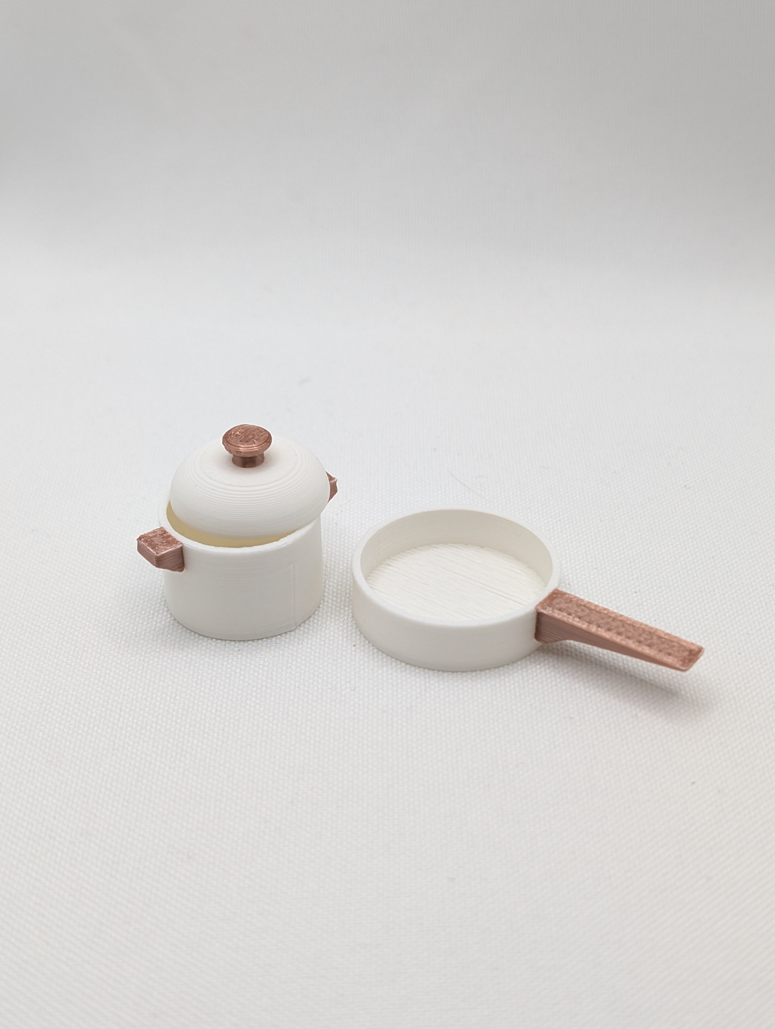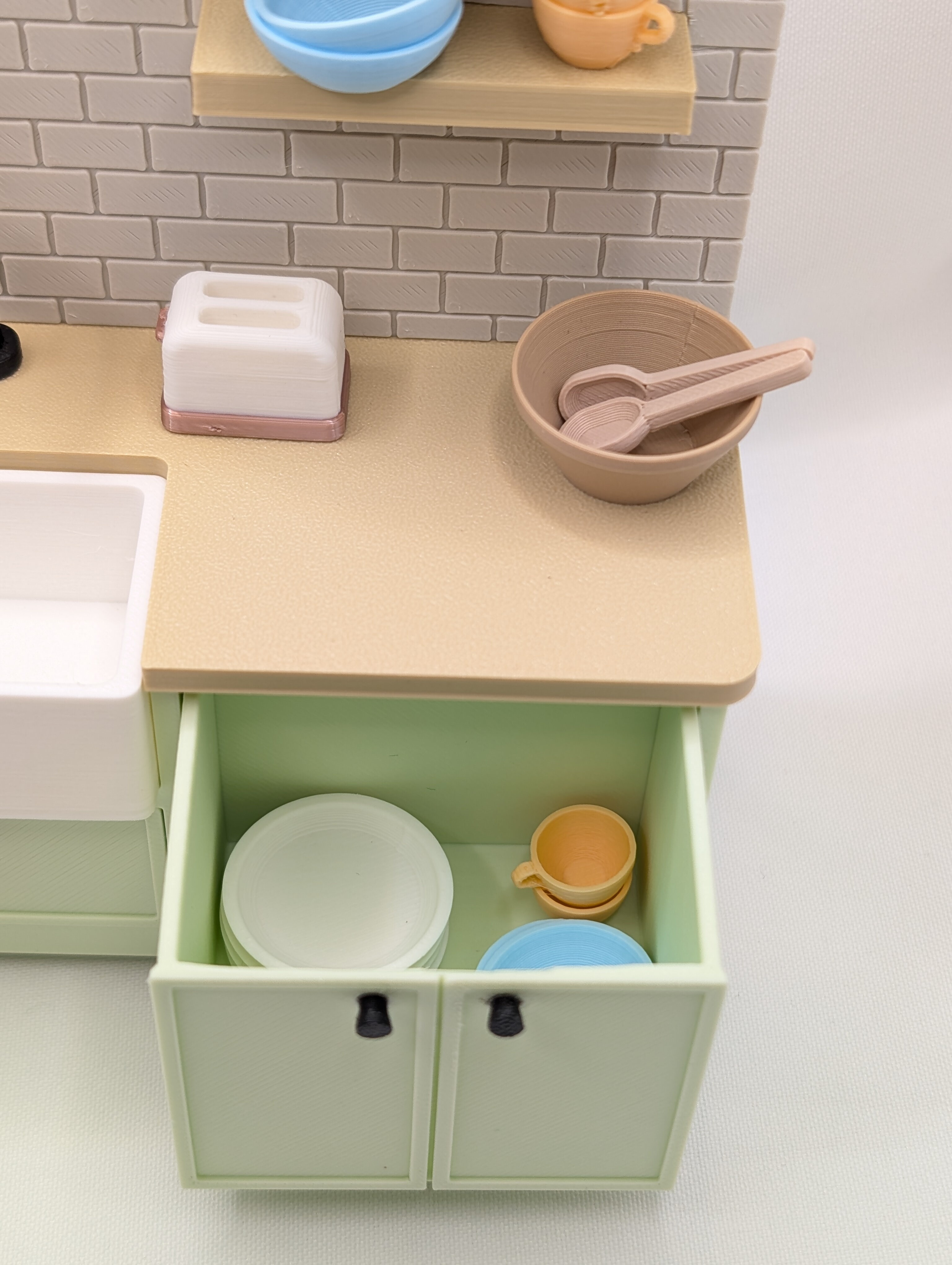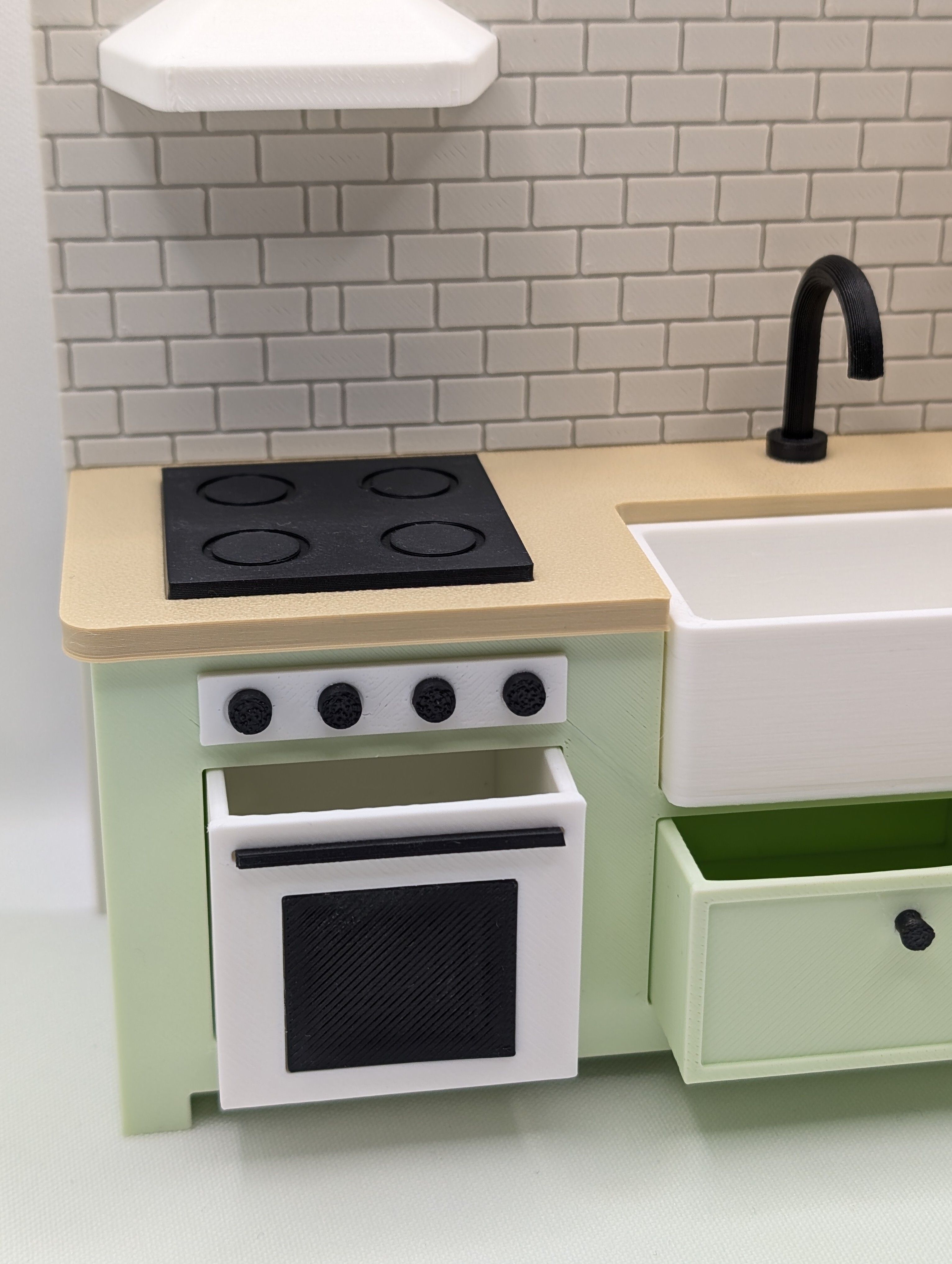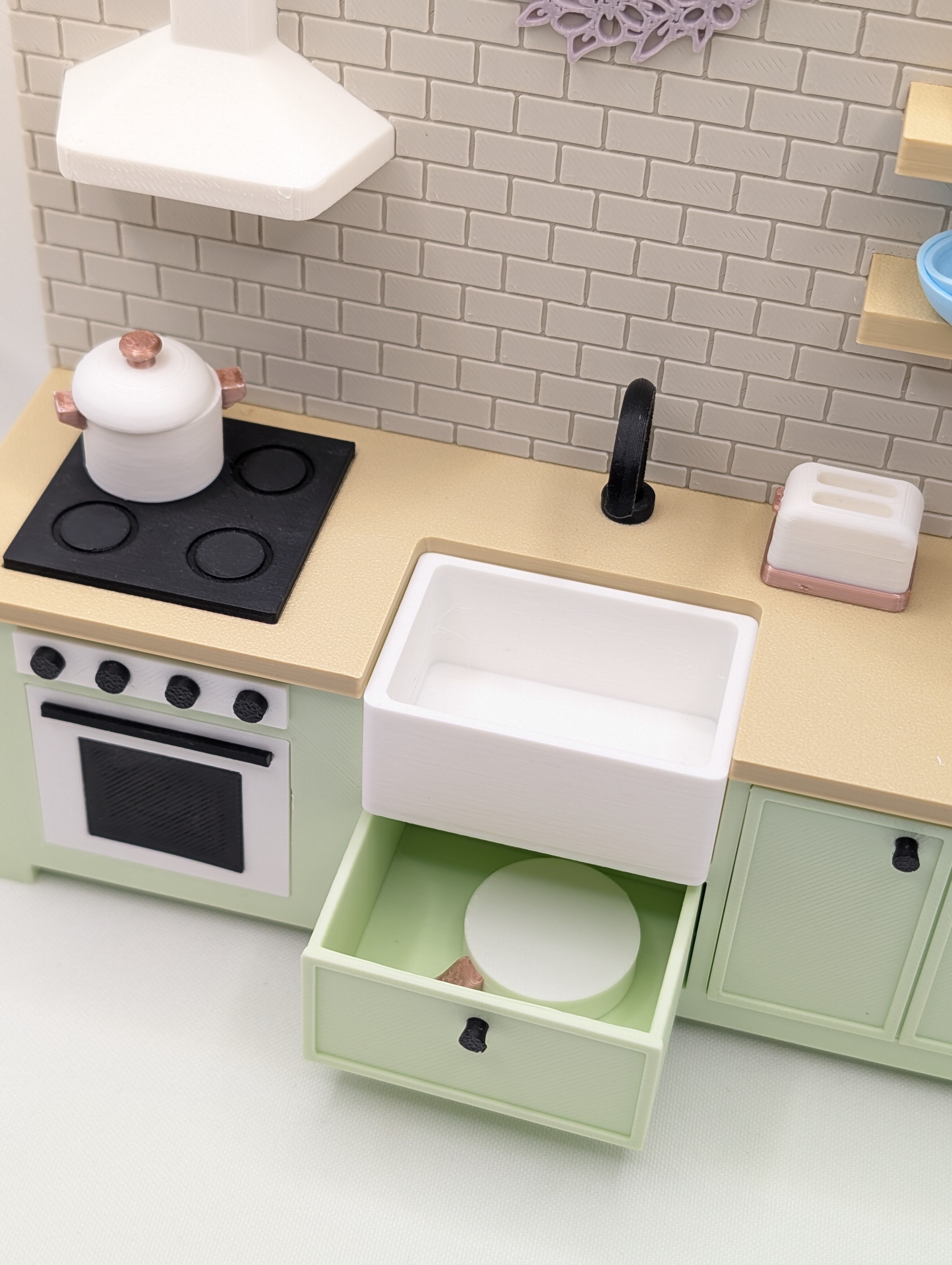 Każdy element został precyzyjnie wydrukowany w technologii 3D, z dbałością o najmniejsze szczegóły – od faktury płytek po maleńkie uchwyty przy szafkach.