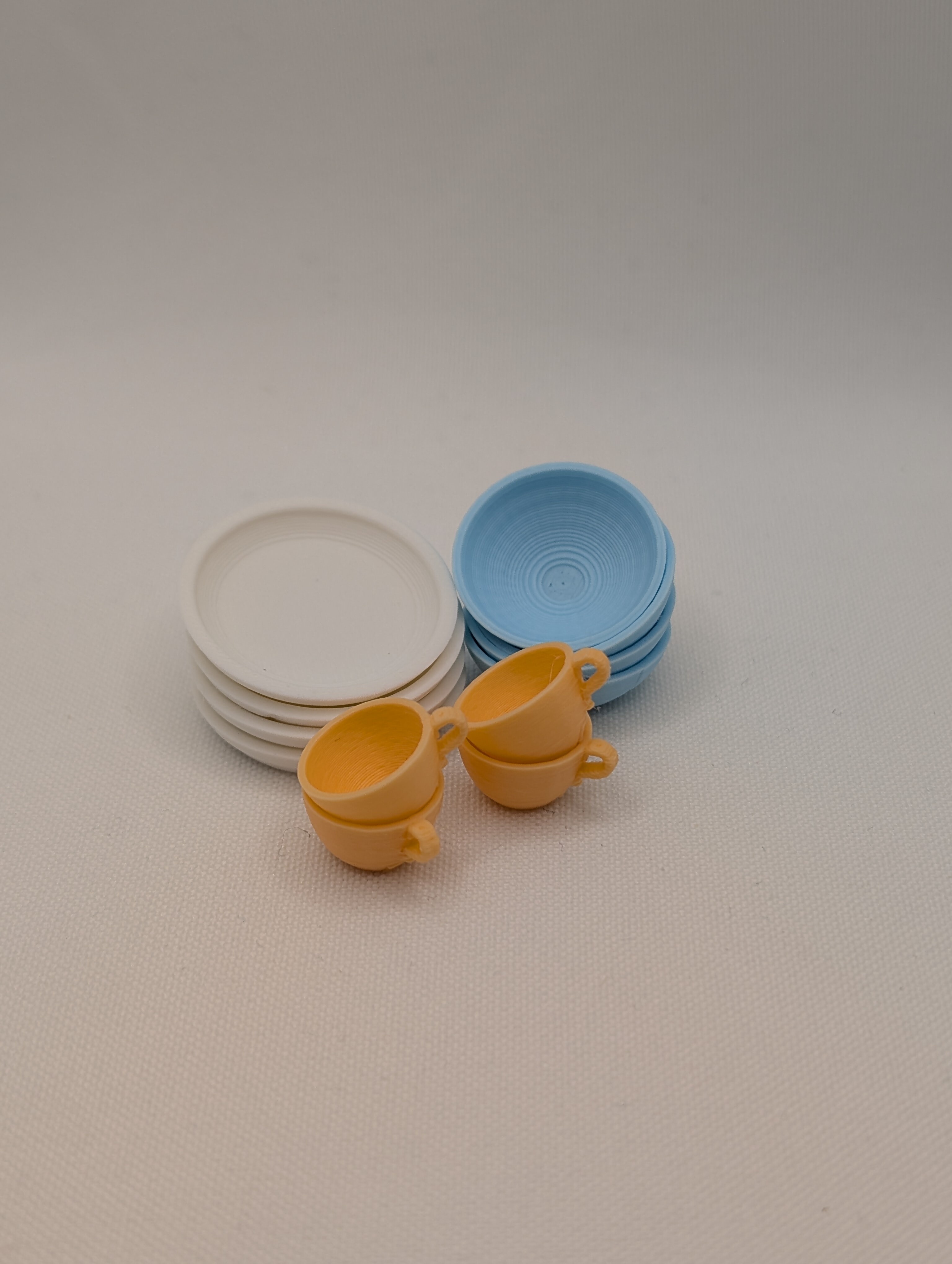 5. Akcesoria kuchenne (zestaw drobnych dodatków): białe talerzyki, 4 niebieskie miseczki, 4 brzoskwiniowe kubeczki z uszkiem, miska z łyżkami, patelnia, garnek z przykrywką, toster, mini wazon i mini kaktus w doniczce