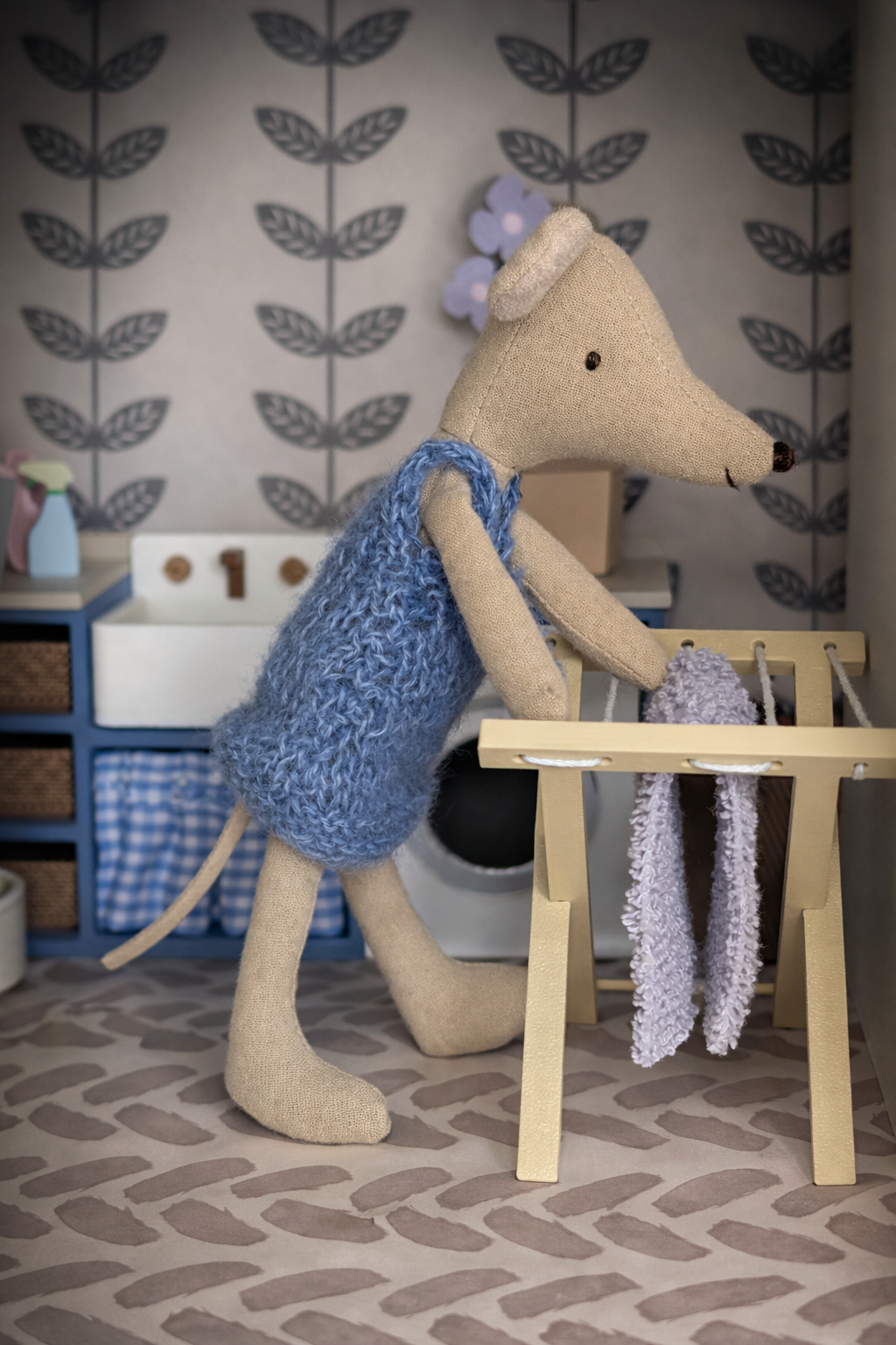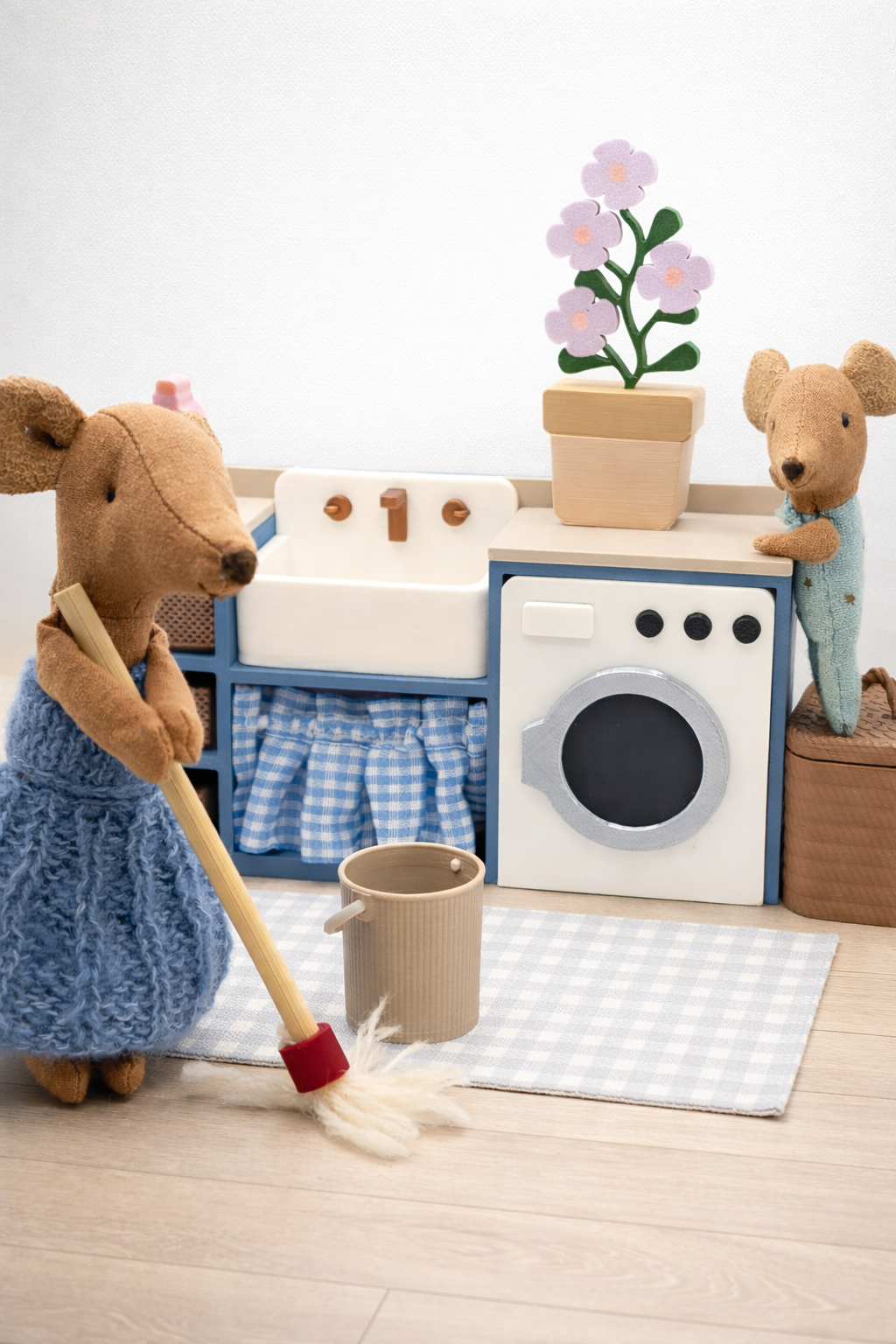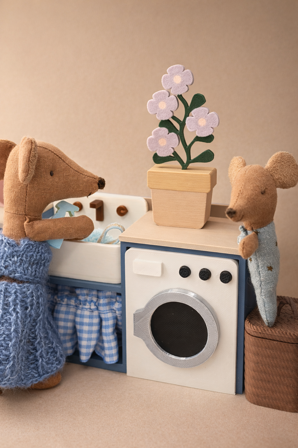 Mała pralnia, która wygląda jak prawdziwa! Ten uroczy zestaw mebelków został stworzony z myślą o myszkach Maileg i małych laleczkach, które potrzebują własnego miejsca do prania, sprzątania i dbania o porządek w domku.