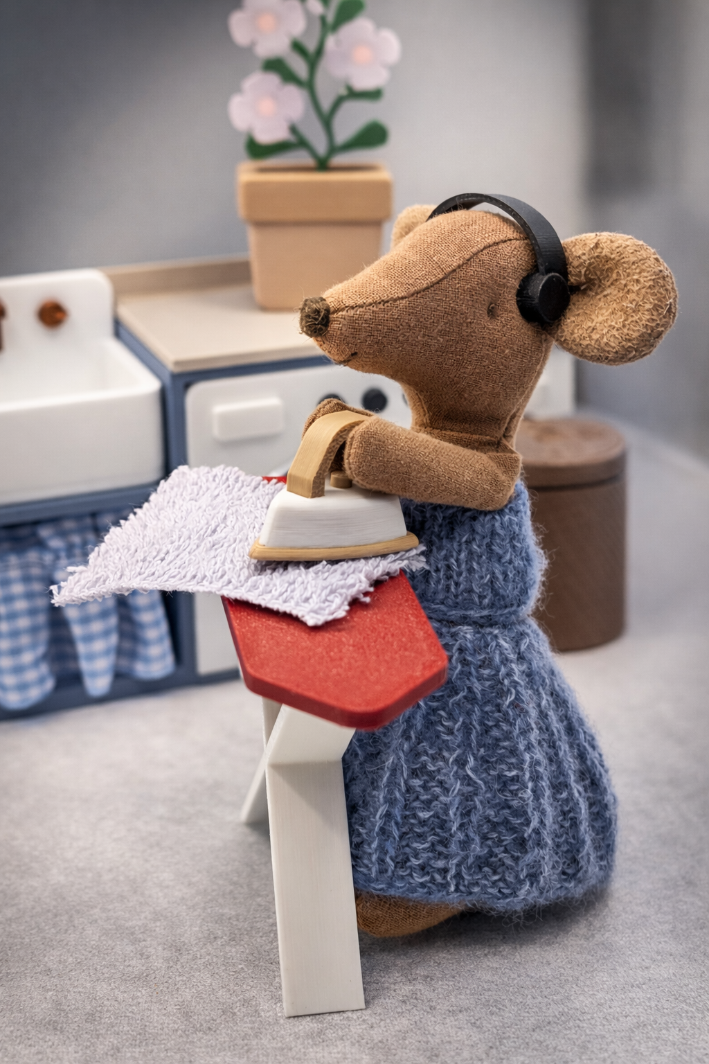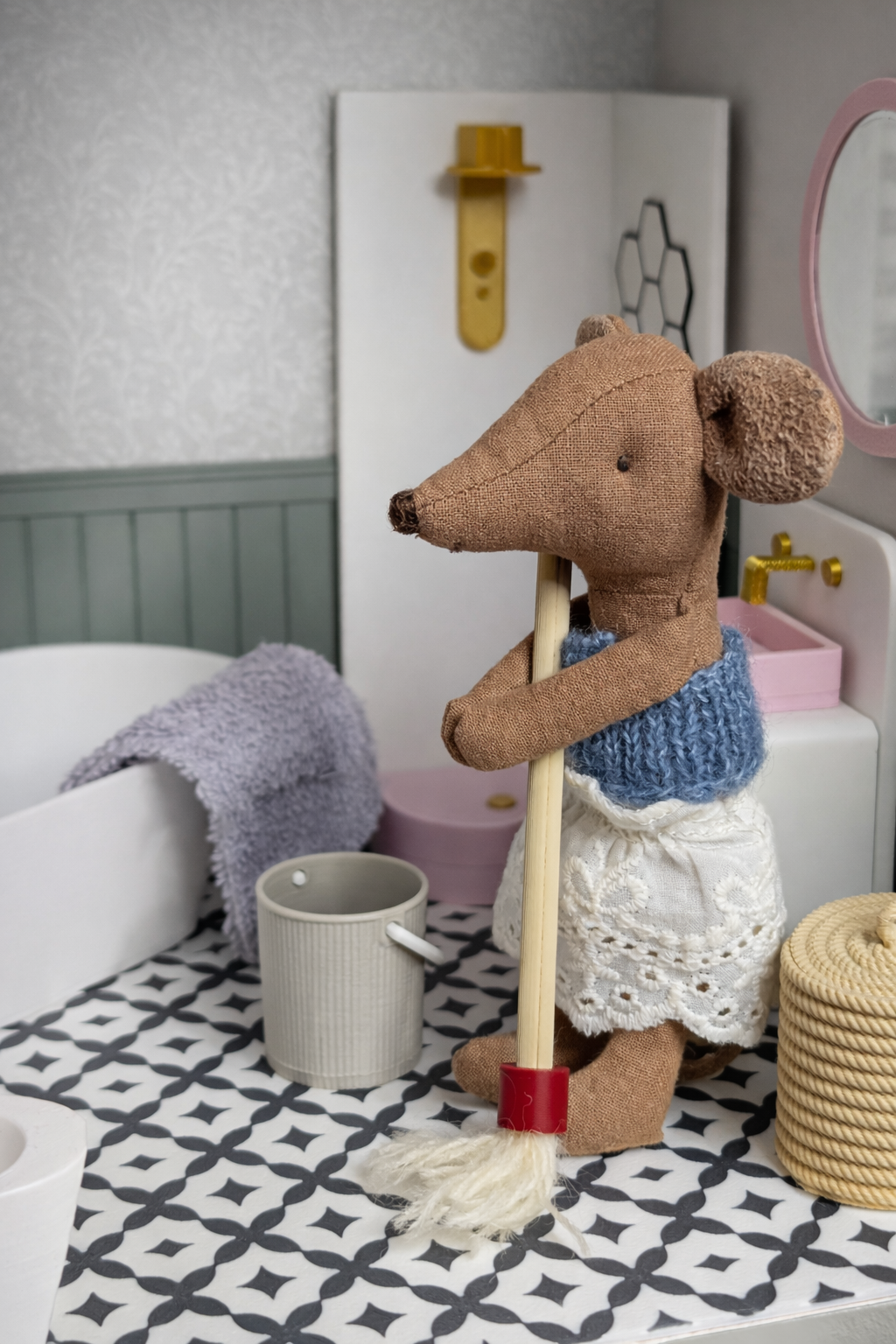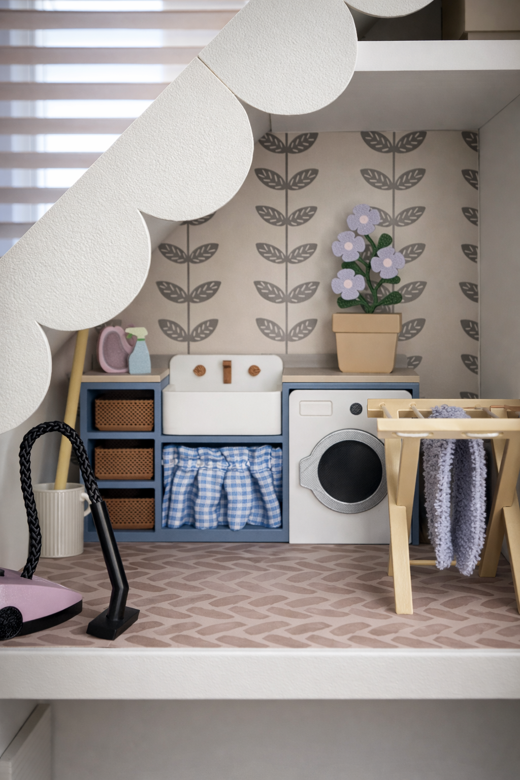 Mała pralnia, która wygląda jak prawdziwa! Ten uroczy zestaw mebelków został stworzony z myślą o myszkach Maileg i małych laleczkach, które potrzebują własnego miejsca do prania, sprzątania i dbania o porządek w domku.