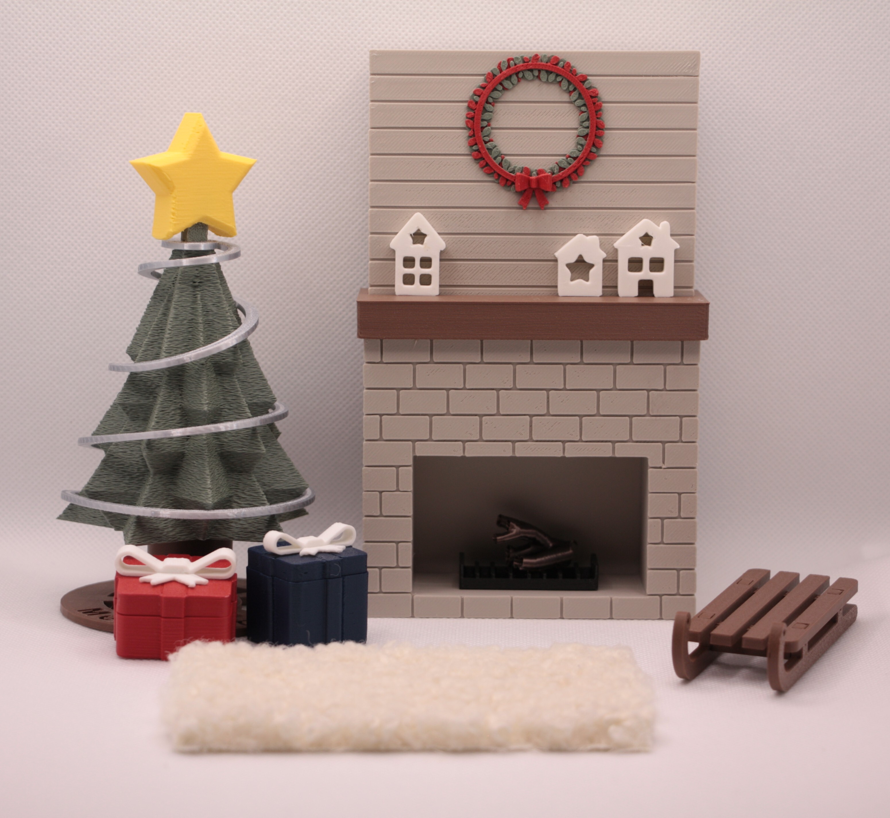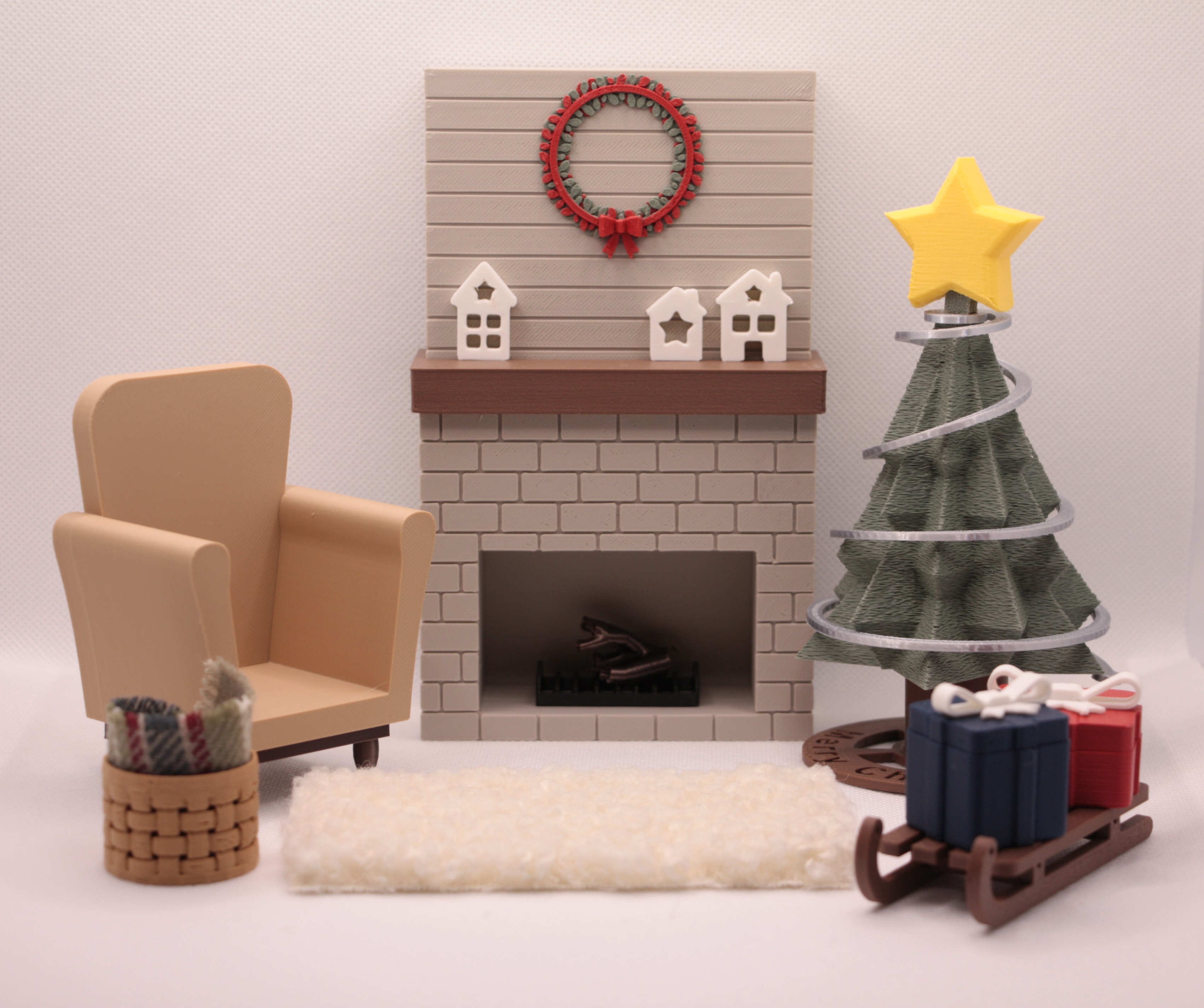 Świąteczna choinka, zestaw mini prezentów, Kominek, Fotel, Dywanik, Kosz z kocykiem, Sanki ozdobne.